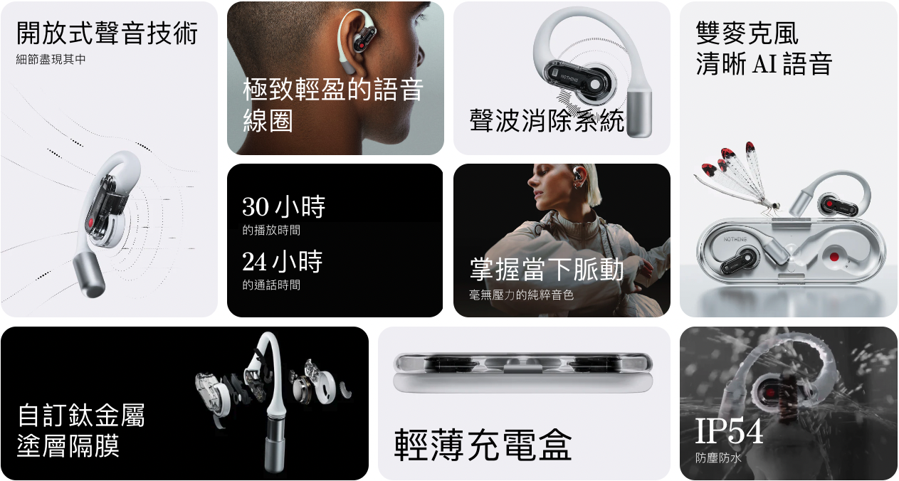 - 開放式聲音技術|極致輕盈的語音線圈|聲波消除系統